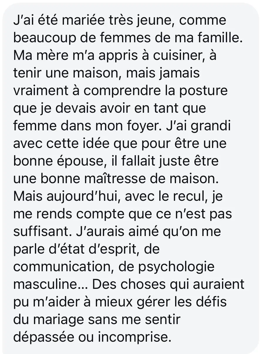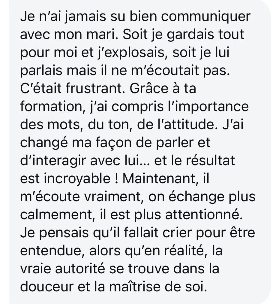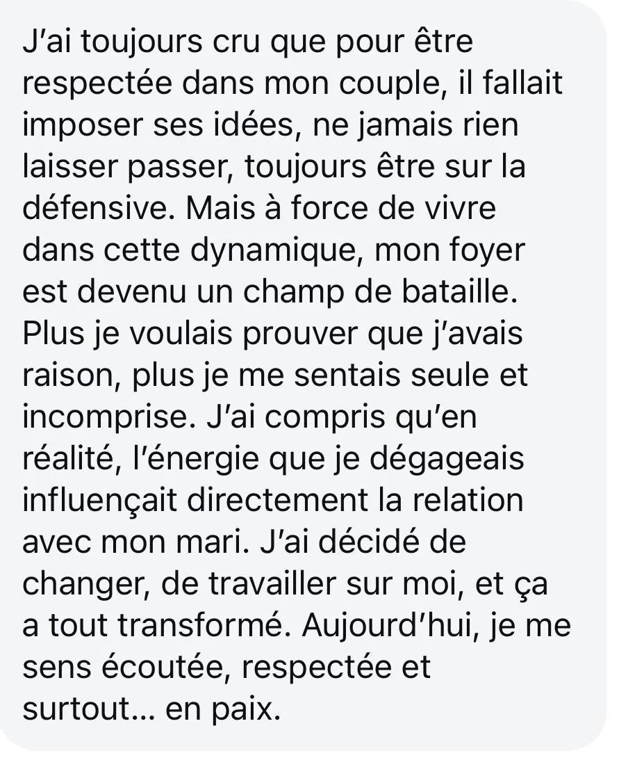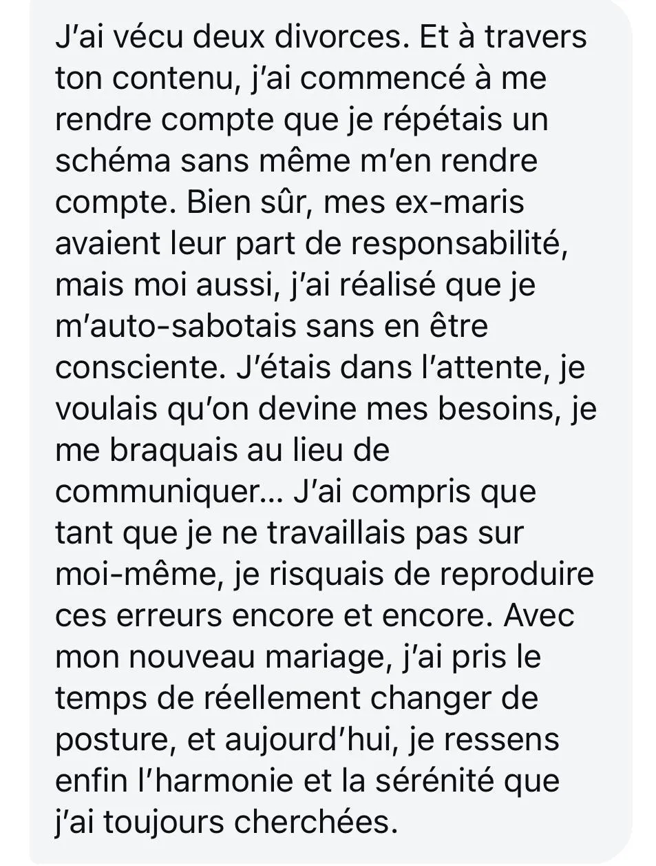 "J’ai créé la formation que j’aurais aimé avoir avant de me marier, celle qui m’aurait sans doute évité un premier divorce et un schéma répétitif lors de mon deuxième mariage. Après avoir compris mes erreurs et appliqué des changements concrets dans mon couple, j’ai vu mon foyer retrouver équilibre et harmonie.