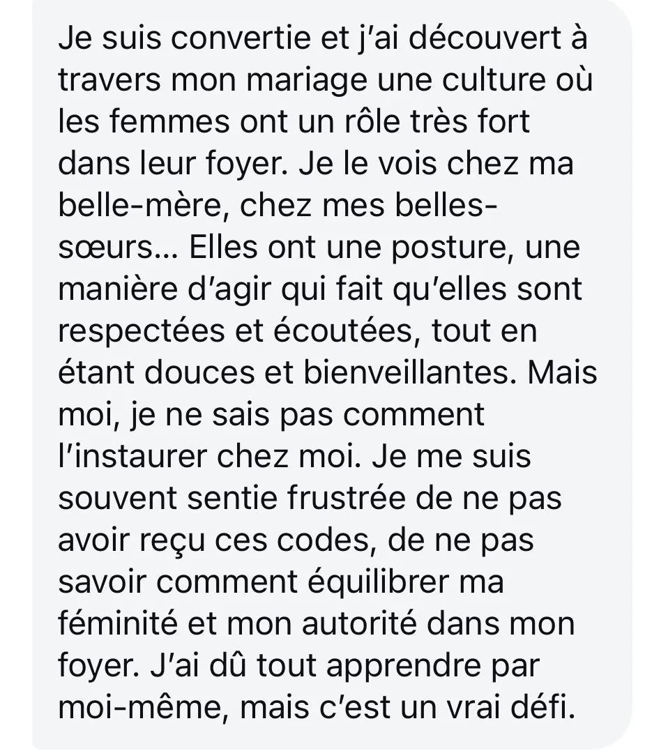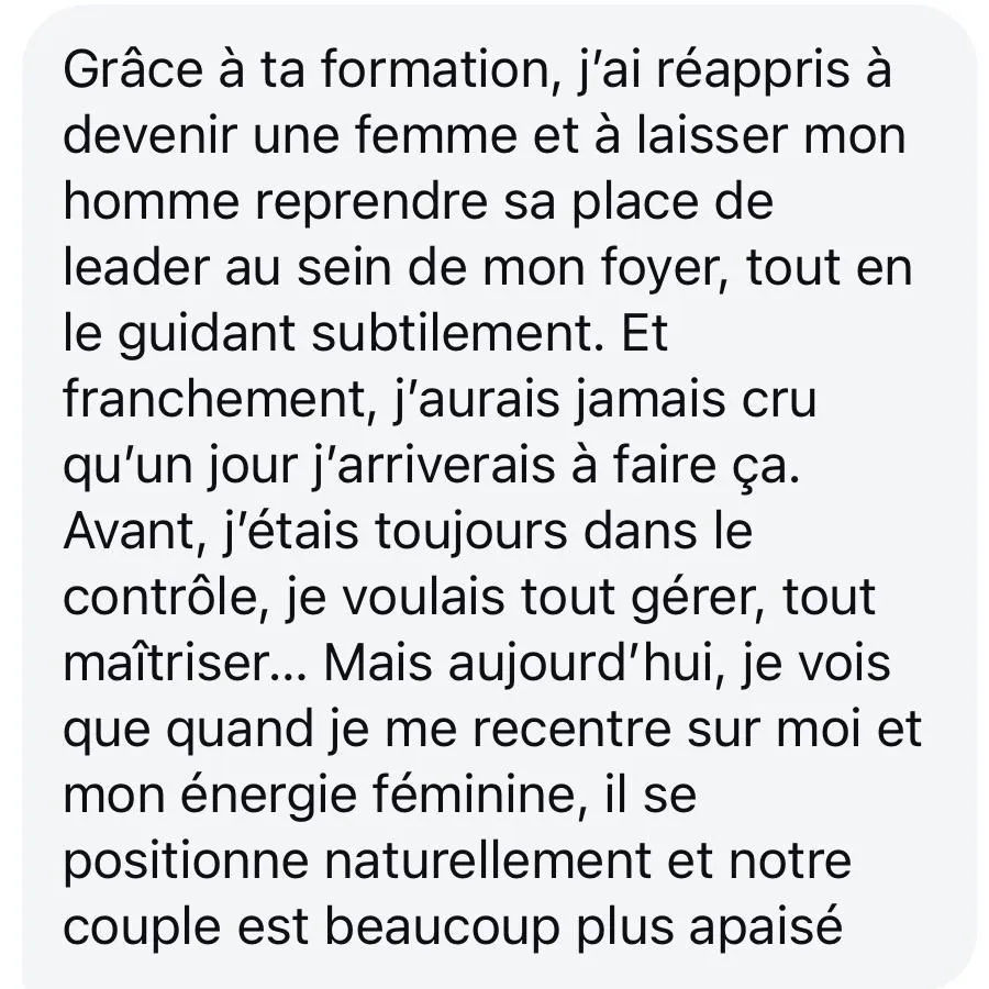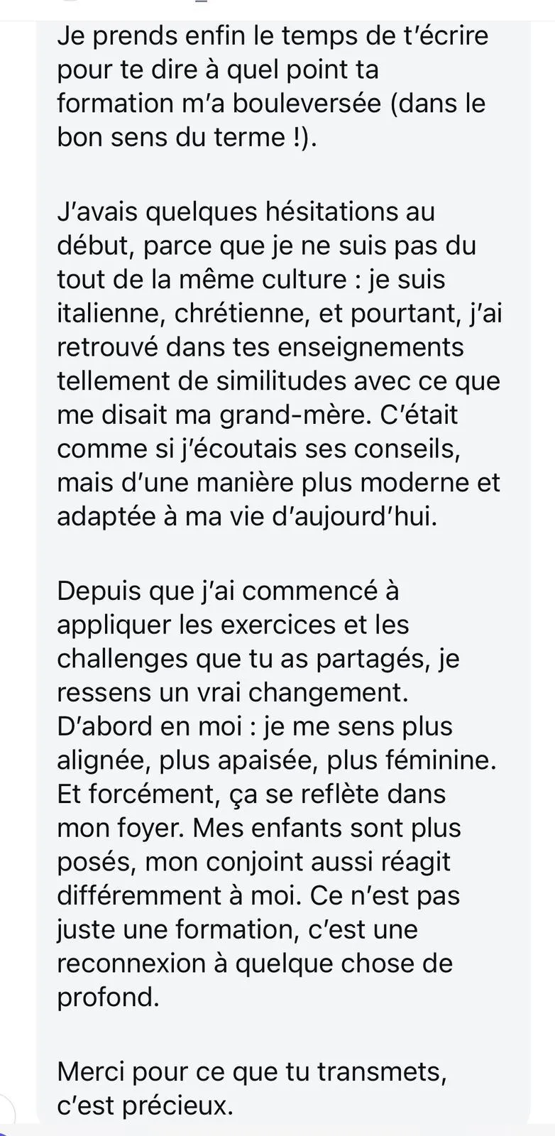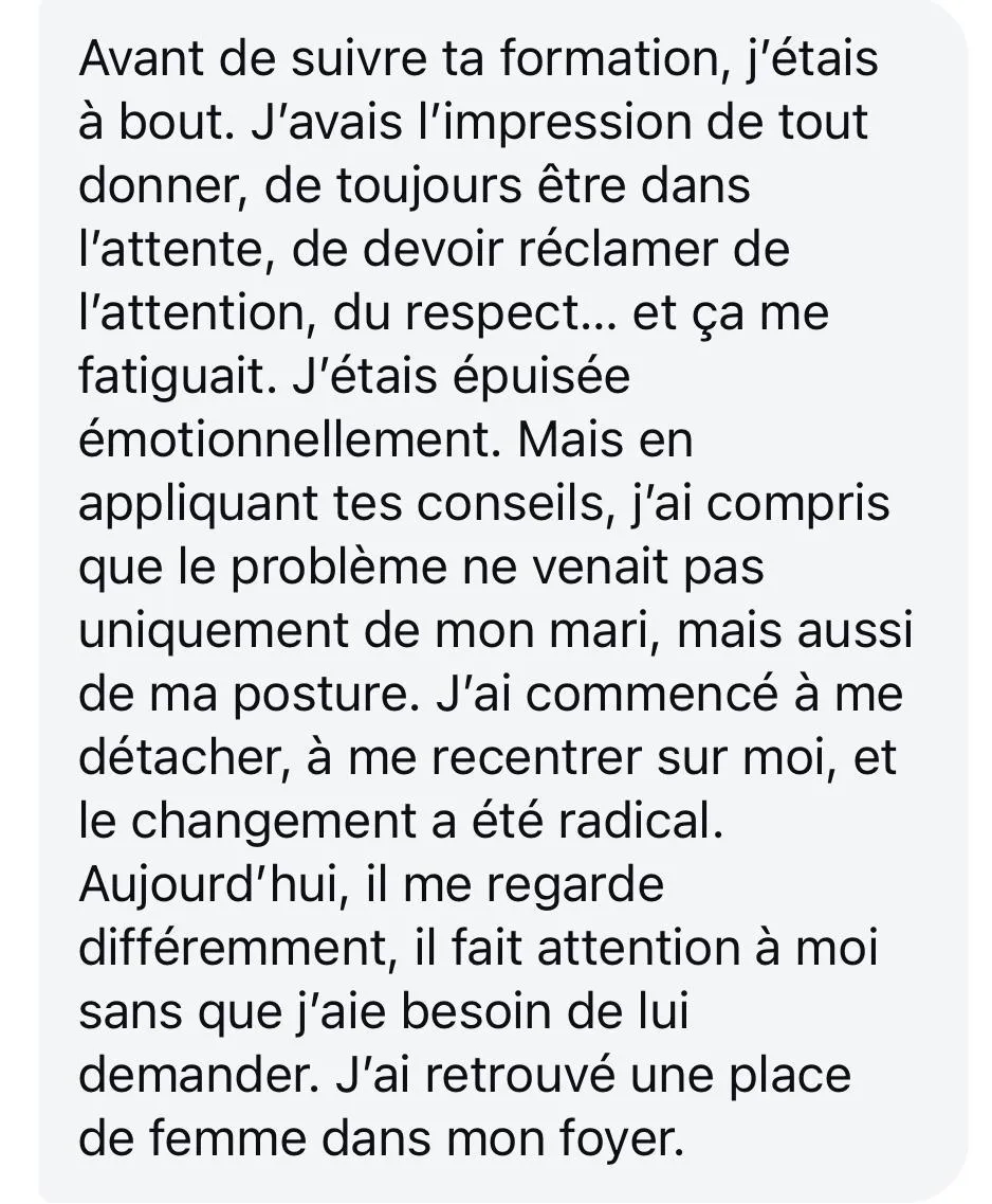"J’ai créé la formation que j’aurais aimé avoir avant de me marier, celle qui m’aurait sans doute évité un premier divorce et un schéma répétitif lors de mon deuxième mariage. Après avoir compris mes erreurs et appliqué des changements concrets dans mon couple, j’ai vu mon foyer retrouver équilibre et harmonie.