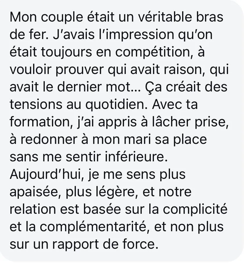 Aujourd’hui, j’ai accompagné plus d'une centaine de femmes à faire de même : mieux comprendre la dynamique du couple, éviter les pièges qui mènent aux tensions et bâtir une relation saine, basée sur le respect, la complicité et l’intelligence émotionnelle.